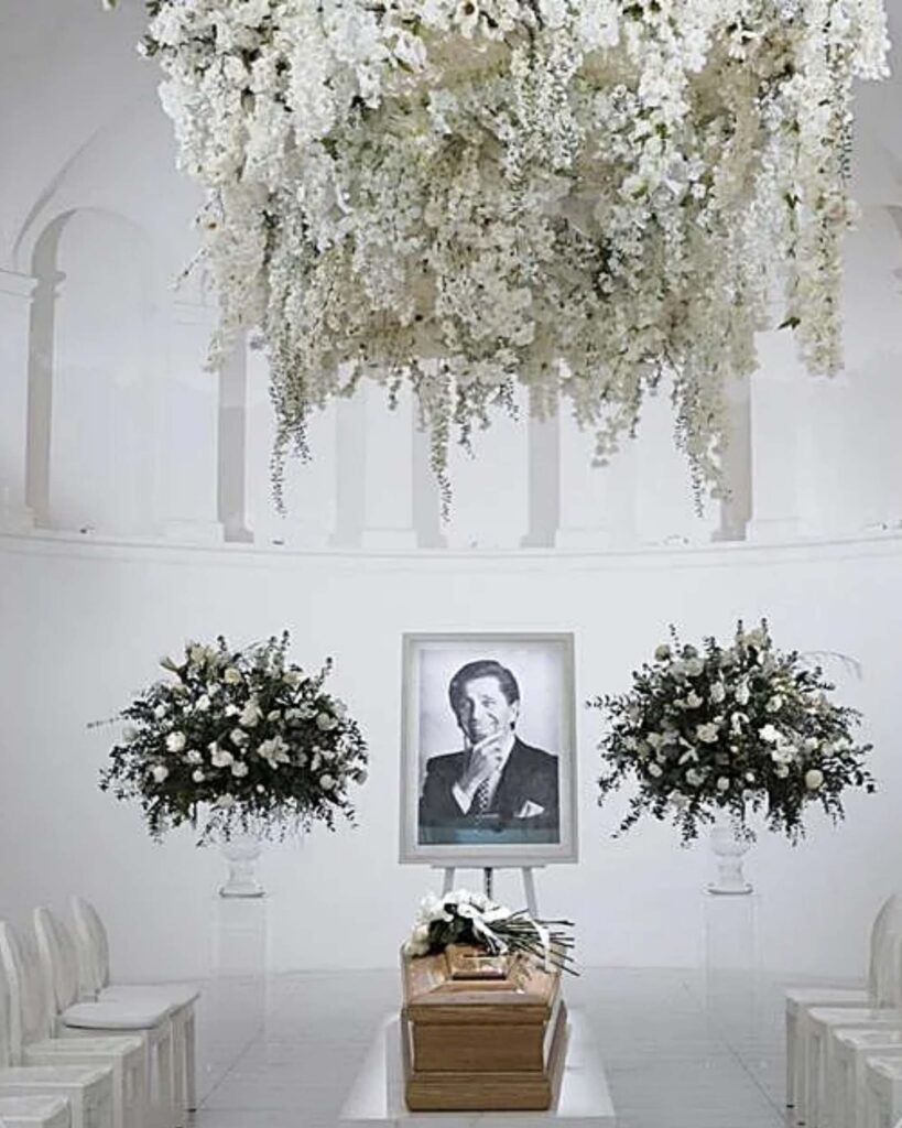 Capilla ardiente en blanco: A diferencia de su icónico «Rojo Valentino», su féretro descansó en el Palazzo Valentino rodeado de un entorno blanco absoluto, bajo una pérgola de anémonas, camelias y dalias. Por allí desfilaron más de 10,000 personas.