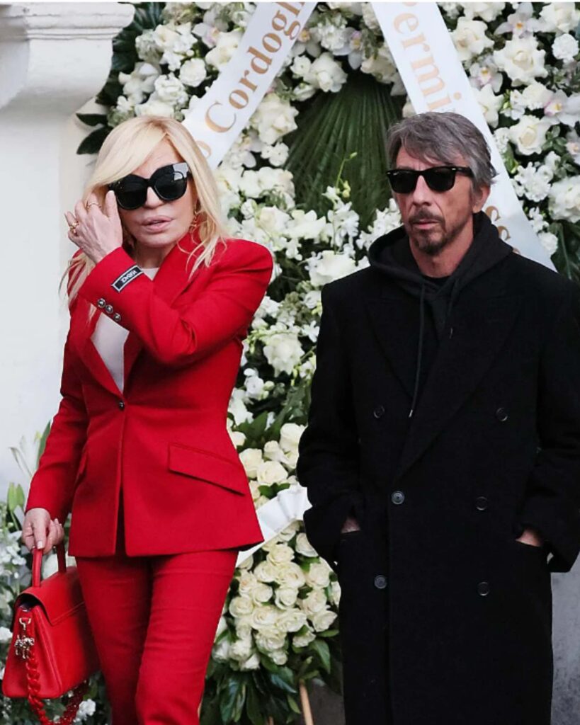El rojo de Donatella Versace: Fue la única en romper el luto riguroso al vestir de rojo, un tributo doble: al color insignia de Valentino y a la amistad que el diseñador brindó a los Versace tras la muerte de Gianni.